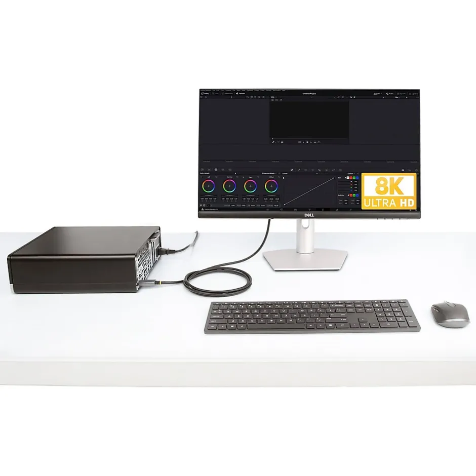 Connect an 8K 60Hz or a 4K 144Hz HDMI display to a DisplayPort-enabled desktop at a distance of up to 6.6′, using this DisplayPort to HDMI adapter cable. This DP to HDMI cable enables resolutions of up to 8K 60Hz and is HDMI 2.1 FRL compliant. It supports HDR10, HDCP 1.x/2.2/2.3, and DSC 1.1/1.2a. The adapter cable supports 7.1 channel audio with Dolby Atmos and DTS:X. Combining a video adapter and cable minimizes potential points of failure and signal loss. Adaptive receiver equalization optimizes the input signal and amplifies the output signal to ensure compatibility with high-resolution monitors. The cable is equipped with cage shielding to prevent Electromagnetic Interference (EMI).