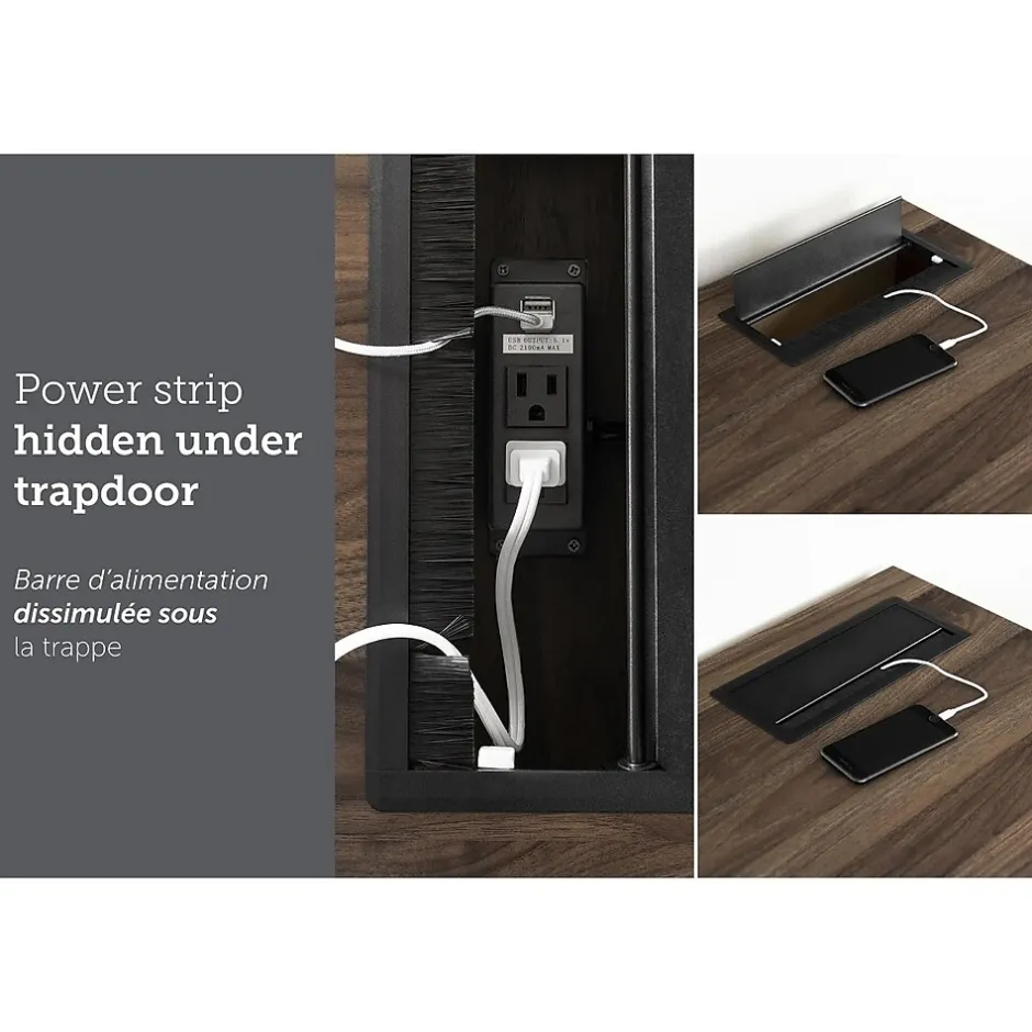 - Power strip is built into the surface, hidden under a trapdoor for a cleaner look; it has two regular outlets and two USB ports, so you can keep your electronic devices plugged in while you continue to work