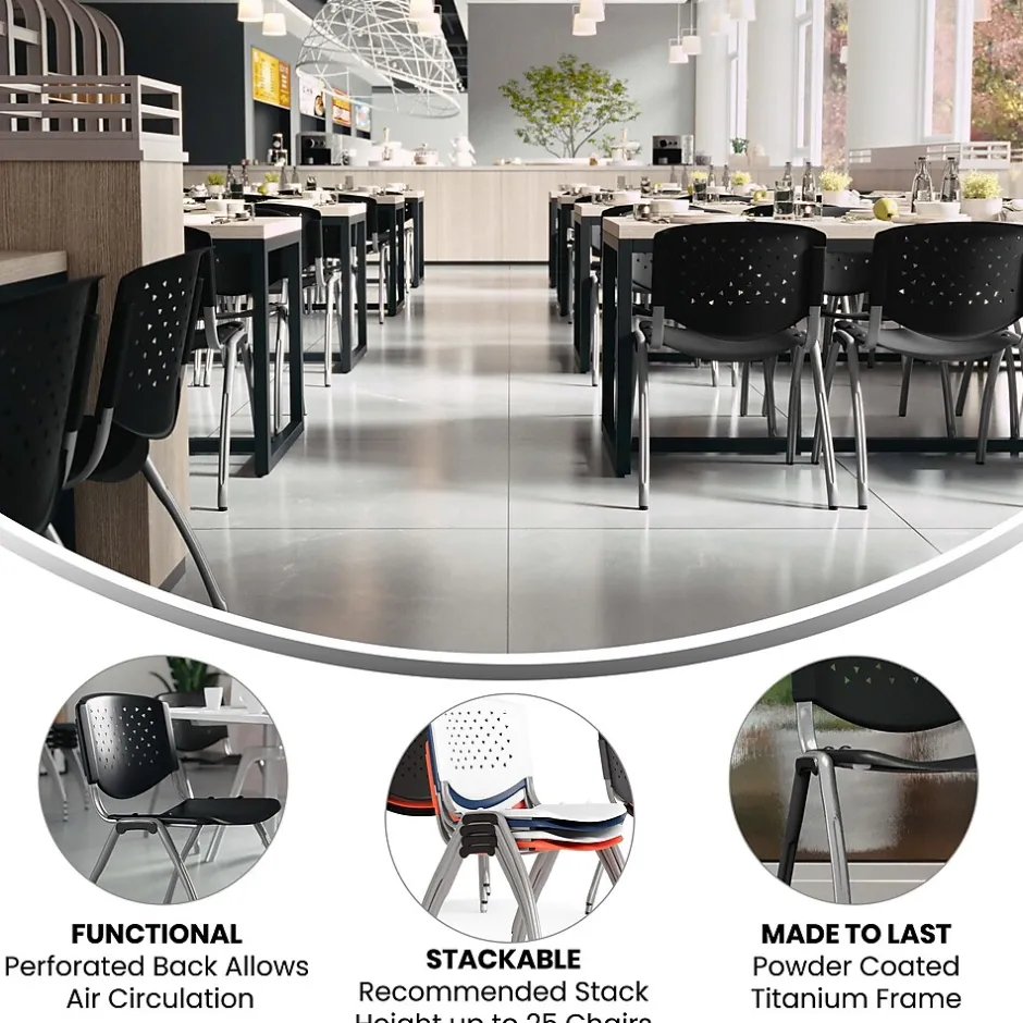 When you need to seat guests in your hair salon, barbershop, or tire shop this plastic stack chair will bring comfort to guests waiting for service. Guests will love the wider seat design that is curved for comfort. The ergonomic design provides angled seating for your visitors to recline while reading a book or scrolling through their phone. Setup training rooms or arrange for guest speakers placing several plastic chairs in a row or around tables. The chair features a perforated back, textured seat and a titanium gray finished powder coated frame that holds up to 880 pounds. Whether you need to furnish a small or large business there’s no job that this heavy-duty plastic guest chair won’t be able to handle. These black plastic stack chairs stack up to 25 chairs high and can be transported across the facility on our steel stack chair and church chair dolly.