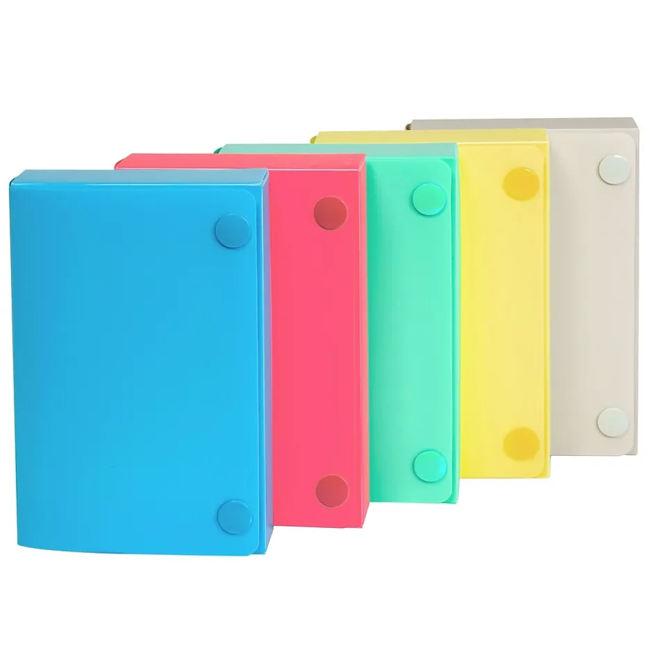 Keep your index cards organized. Durable polypropylene card case holds up to 100, 3 x 5 inch index cards. Features snap closure and includes 5 dividers and adhesive label tabs. Acid-free polypropylene. Assorted colors include Seaside Blue, Sunny Yellow, Seafoam Green, Sunset Red, and Sandy Gray (no color choice). Pack of 24.