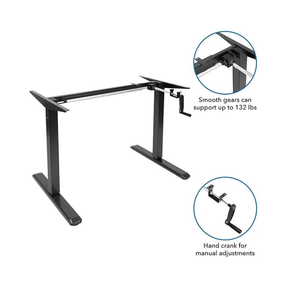 This manual height-adjustable frame is perfect for the office, schools, home, and most working environments. The easy-to-operate Mount-It! hand crank adjusts the desk height, giving you flexibility to sit or stand in seconds. The durable steel frame provides durability that is sure to withstand heavy and repeated use. Go above and beyond, and add an anti-fatigue floor mat or an under-desk CPU mount to your setup. Use this ergonomic sit-stand desk as a long-term investment for both your employees and your business. The tabletop is easily cleanable with a damp cloth.