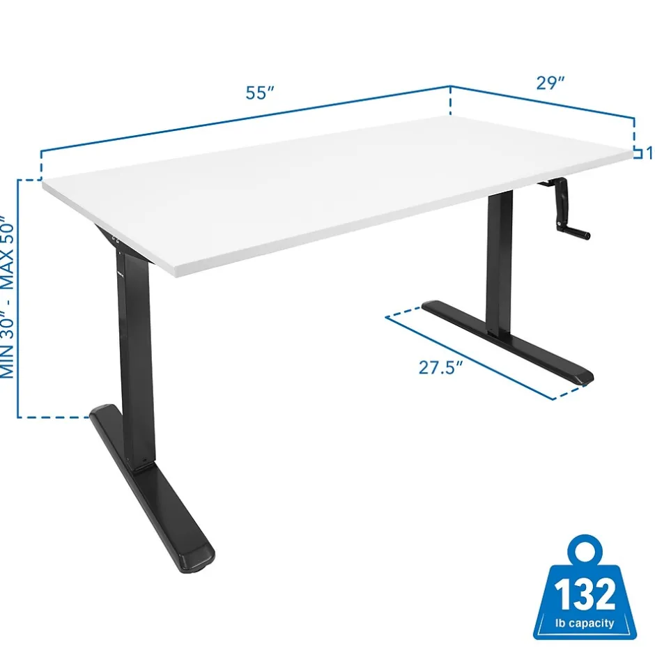 - Easy-to-use crank system adjusts the height of the desk from 30″ from the ground up to 50″