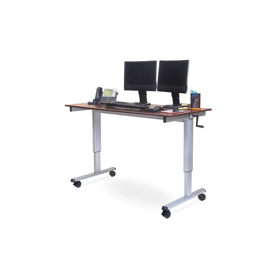 Foster a healthy work environment with this stand-up desk. The steel frame offers stability and is easily height-adjustable with the central crank, and four casters allow for convenient movement from one workspace to another. This Luxor sit and stand desk has a wide surface to accommodate a mobile workstation.