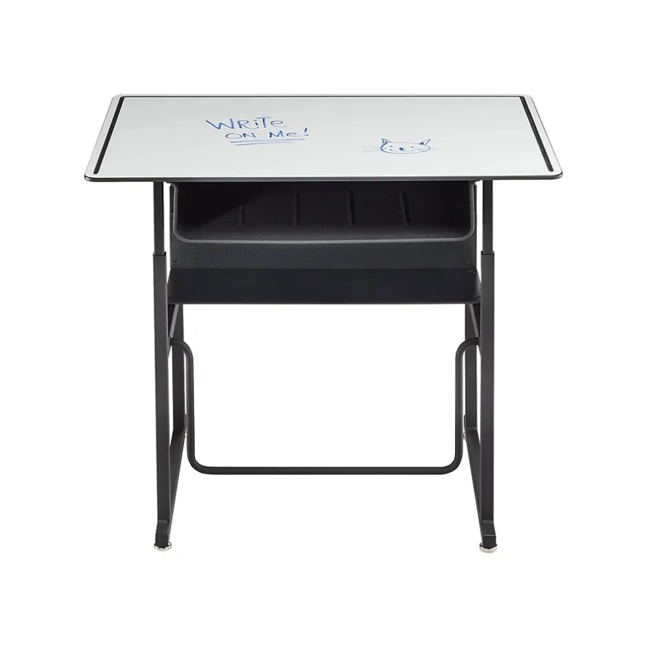 Safco AlphaBetter is an adjustable-height stand-up student desk with swinging footrest (fidget bar). Patented Swinging Pendulum footrest bar allows students to redirect excess energy and engage in continuous motion that may help support ergonomic comfort and cardiovascular health, while potentially increasing calorie burn, productivity, and focus. The desktop is large enough to accommodate laptops, textbooks, and supplies for project learning. The desk features adjustable nylon base levelers for stabilization and easy movement across smooth and carpeted floors. Phenolic resin open shelf provides easily accessible storage area for school supplies and personal items.