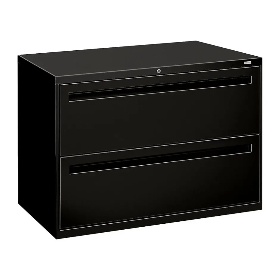 Keep important papers tidy and contained with this two-drawer lateral filing cabinet. Each 3.5 cubic foot drawer accommodates plenty of files, while the built-in counterweight and adjustable leveling glides ensure stability. The professional black finish lends sophistication to your office environment, and the full-width handles simplify drawer opening. This HON Brigade lateral file includes interchangeable-core removable locks to secure confidential papers.