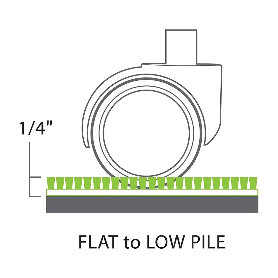 - Protects flat to low-pile carpets up to 1/4″ thick (including padding depth) from chair caster wear and tear