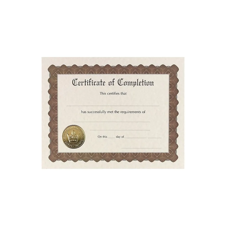 Great Papers Certificate of completion with gold metallic border features 1.75″ embossed seal. Certificate measuring 11″ x 8 1/2″ is compatible with inkjet printers.