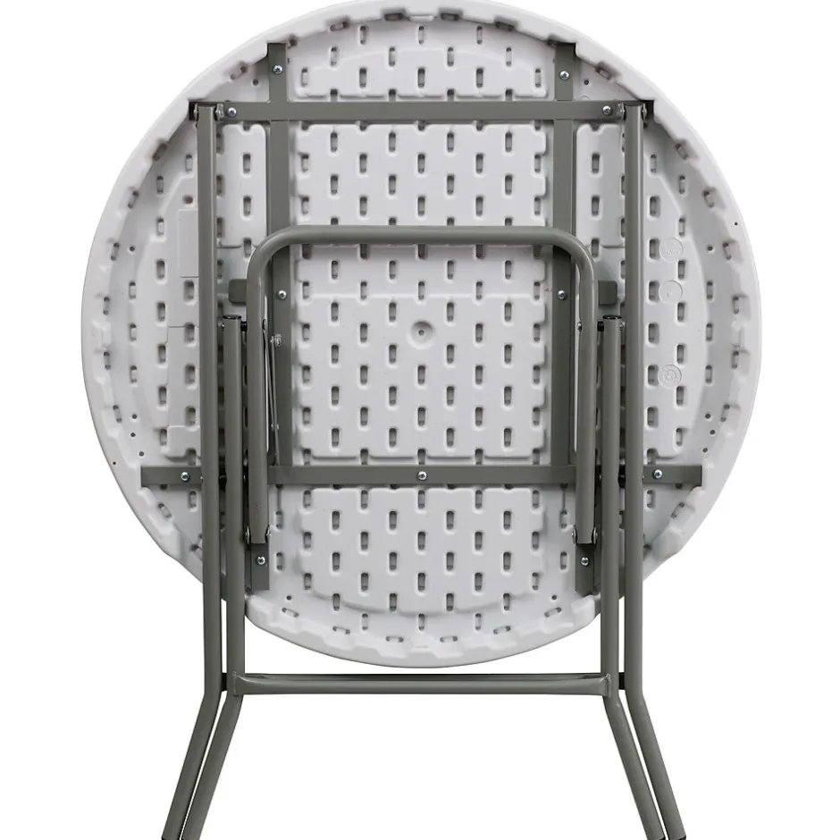 When you need a little extra surface area this folding table is the perfect choice. This plastic folding table is a convenient option when you need to set up tables for special events, cook-outs on your patio at home or when you’re serving snacks around the pool. This durable, easy to clean table is commercial rated for use in banquet halls, convention centers and at trade shows. The thick, granite white tabletop is 1.75″ thick, and will comfortably seat up to 3 adults. Its waterproof, impact and stain resistant top have a 220 pound static load capacity. Non-Locking gray powder coated cross legs fold to transport and store. Non-marring floor caps protect your floor by sliding smoothly when you need to move it. The 32″ Round Granite White Plastic Folding Table is a convenient option for your next home, school or business event. Designed for both indoor and outdoor use, store table indoors and protect the frame from extreme moisture.