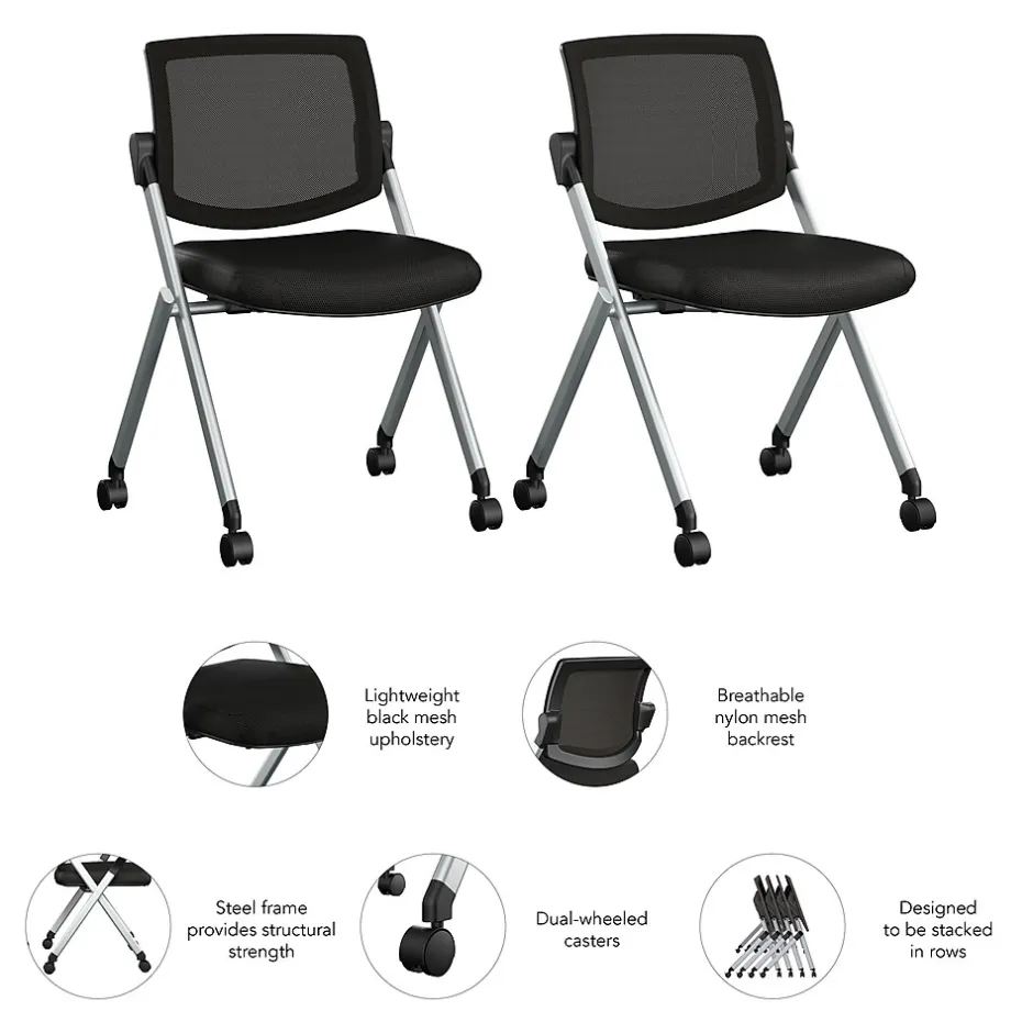 Enhance your meeting space with the Bush Business Furniture Envision Mesh Back Folding Chairs – Set of 2, designed for comfort and versatility, folding neatly away when not in use to save valuable space. The cushioned seat with lightweight black mesh upholstery offers long-lasting comfort with modern style. Simple, durable design is perfect for an office, conference center, training room, school or place of worship. Dual-wheeled casters allow the office chair set to be set up and rearranged at a moment’s notice. Steel frame provides structural strength with a weight capacity of 275 lbs., while the cushioned seat measures 18W x 18D. Bush Business Furniture’s commitment to safety includes rigorous testing that meets or exceeds ANSI/BIFMA 5.5 commercial test standards. Backed by a 5 Year Manufacturer’s Warranty.
