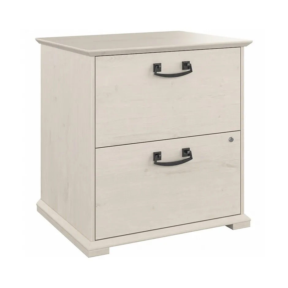 The Bush Furniture Homestead farmhouse-style lateral file cabinet offers a practical storage solution with an appealing modern farmhouse style. This filing cabinet utilizes Tip Guard safety features that include a stable design, a counterweighted back panel, wall attachment hardware, and safe-open drawers. Locking file cabinet’s drawers pull out one at a time for safe use and each support up to 50 lbs. Full-extension ball bearing slides provide easy-reach access to the letter-, legal-, and A4-size paperwork. A single lock secures both drawers for your privacy. Decorative trestle patterns, chamfered profile edges, and antique silver hardware give this cabinet a casual farmhouse style. This file cabinet has been tested to meet the ANSI/SOHO quality standards for safety and performance and is backed by a 1-year limited warranty. See the complete Homestead collection for more items.