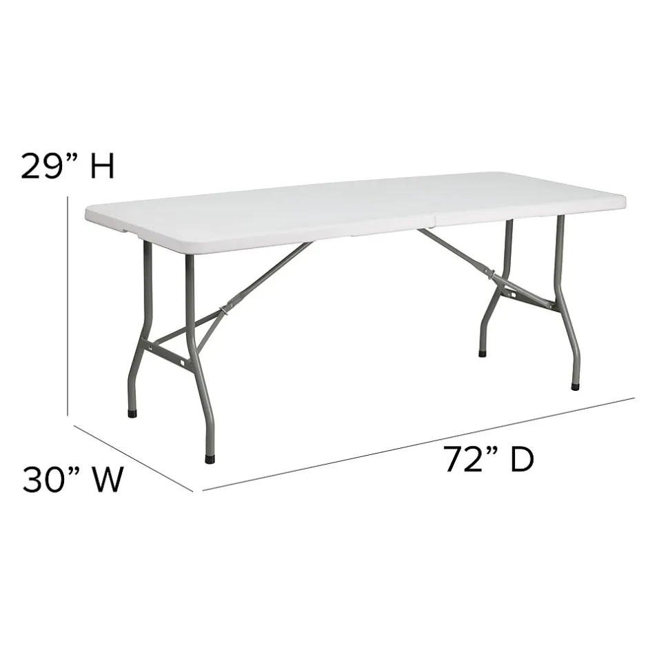 Advertise your business and products at the Expo on this portable folding table. This 6′ long banquet table accommodates up to 8 people and seats extra guests during holiday gatherings. Built for commercial use this heavy-duty folding table makes appearances in restaurants, warehouses, schools, churches and rec centers. Folding tables can be used for all your sit-down activities and their legs lock when folded for storage. This versatile centerfold table can be dressed up during holiday events and parties. If you have hard flooring at your banquet hall the floor caps prevent scratches and glide smoothly across floors. Easy to clean and store, plastic folding tables are the best option for any occasion. Although designed for indoor events this party table can be used outdoors on the patio during good weather but must be stored indoors. Get your ready to use rectangular folding table for your home or business today.