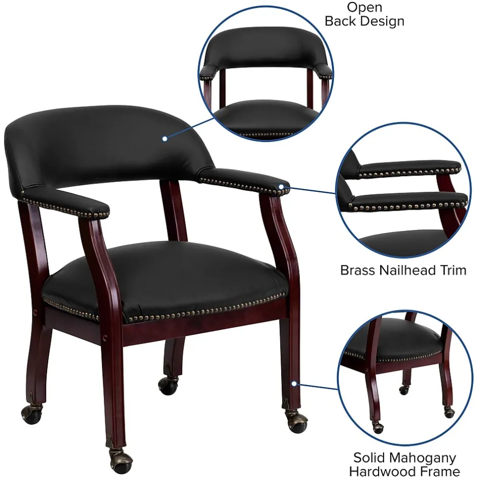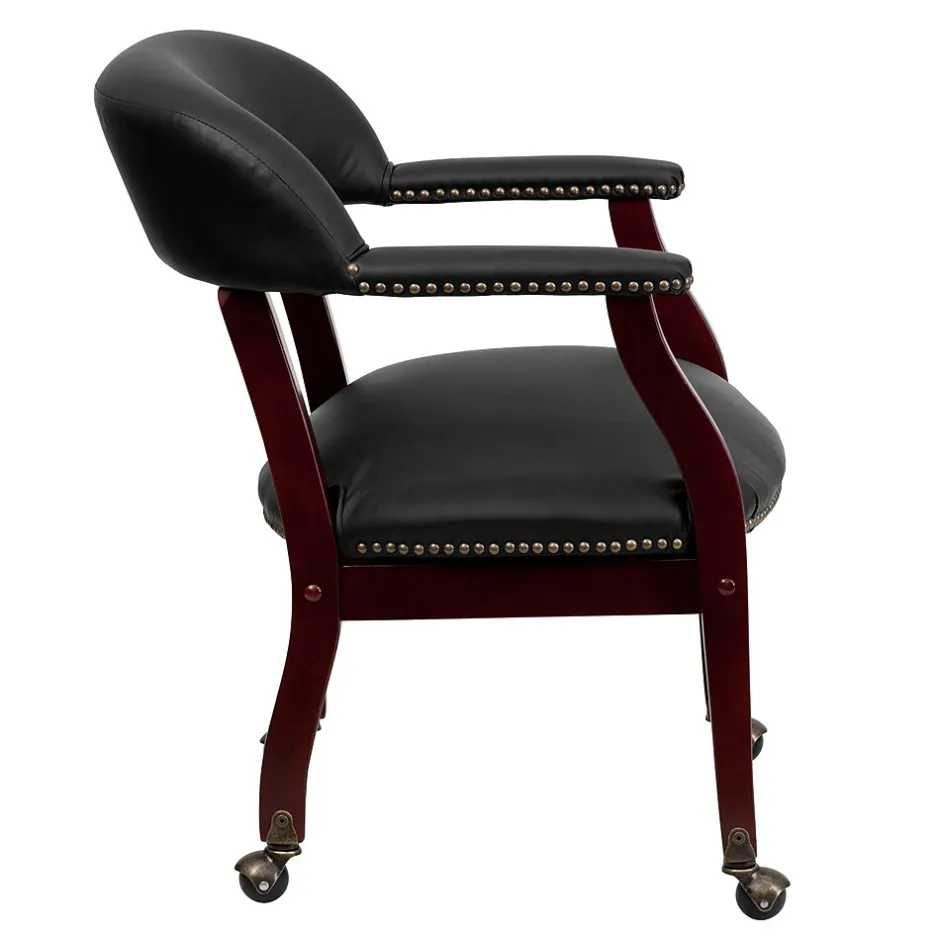 Give clients, customers, and vendors a warm welcome with this Flash Furniture mid-back captain’s chair. A classic silhouette gives this visitor’s chair traditional style, while the brass nailhead trim and leather upholstery deliver an upscale appearance. Equipped with durable brass-hooded rolling casters, this chair is easy to move from one room to the next. The plush seat and curved seat back feature soft, contoured padding for cushioned support, offering visitors a more enjoyable seating experience while waiting for an appointment or meeting. Featuring an open-back design, this Flash Furniture mid-back captain’s chair provides ventilation to keep your guests cool and comfortable throughout intense contract negotiations or job interviews.