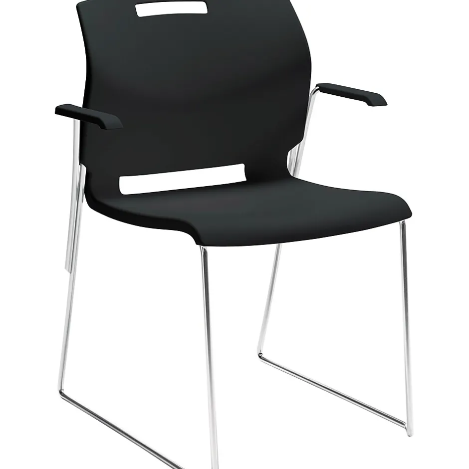 Hot Popcorn Stack Chair with Arms, Plastic, Asphalt Black, Seat: 18″W x 18″D , Back: 19.5″W x 16″H Folding & Stacking