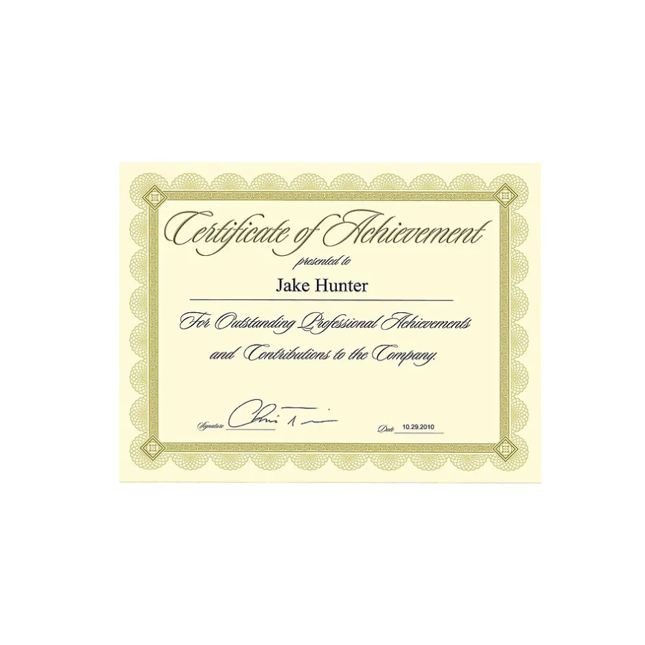 Preserve accomplishments for posterity by using these acid-free and lignin-free certificates that stand the test of time without decaying. These certificates feature gold-foil enhanced, Spiro design borders that give documents a distinguished look. The 66-pound heavyweight cotton paper of these certificates provides a pleasing feel for any award. These Southworth premium certificates work with both laser and inkjet printers.