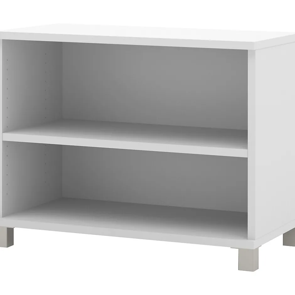 - This bookcase offers metal legs and two shelves, one of which is adjustable.