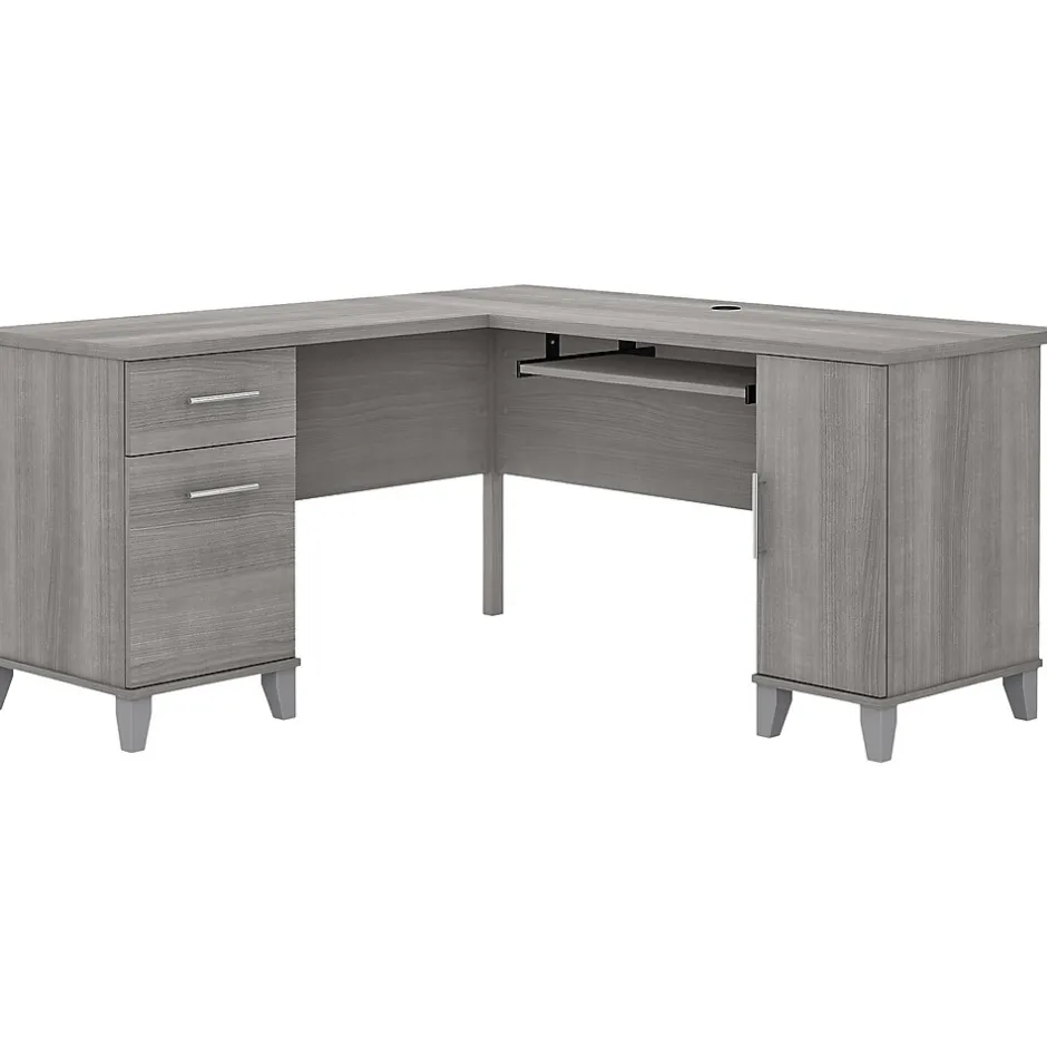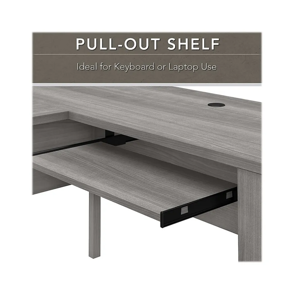Build your ideal home office around the Bush Furniture Somerset 60″W L-shaped desk featuring transitional style and plenty of storage space for work materials. Maximize the potential of your home office with this desk. Create your remote work headquarters with space for a computer, phone, printer, and more on a surface that features a wire management grommet for keeping cords and cables in order. A convenient pull-out tray provides a perfect place to keep a keyboard or laptop, and the desk also includes a vertical storage cabinet with an adjustable shelf. Place pens, paper, and more in the box drawer, and enjoy a file drawer gliding on smooth ball bearing slides for an easy reach to documents. The transitional styling includes an elegant finish with tapered legs and contemporary metal hardware for an alluring appearance. This L-shaped desk with storage is tested to meet ANSI/SOHO standards for safety and performance and is backed by the Bush Furniture 6-year manufacturer warranty. American-made with US and imported parts.