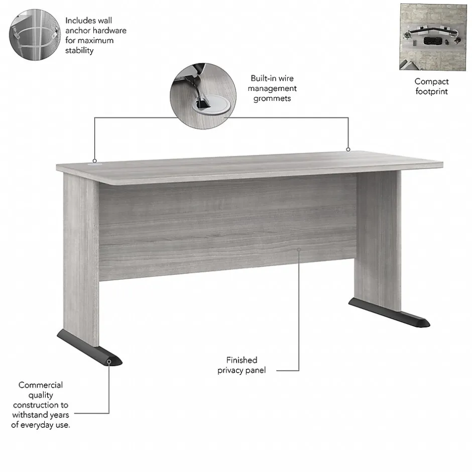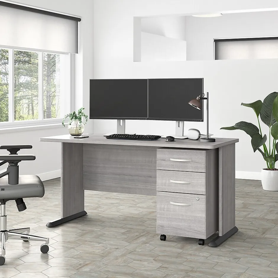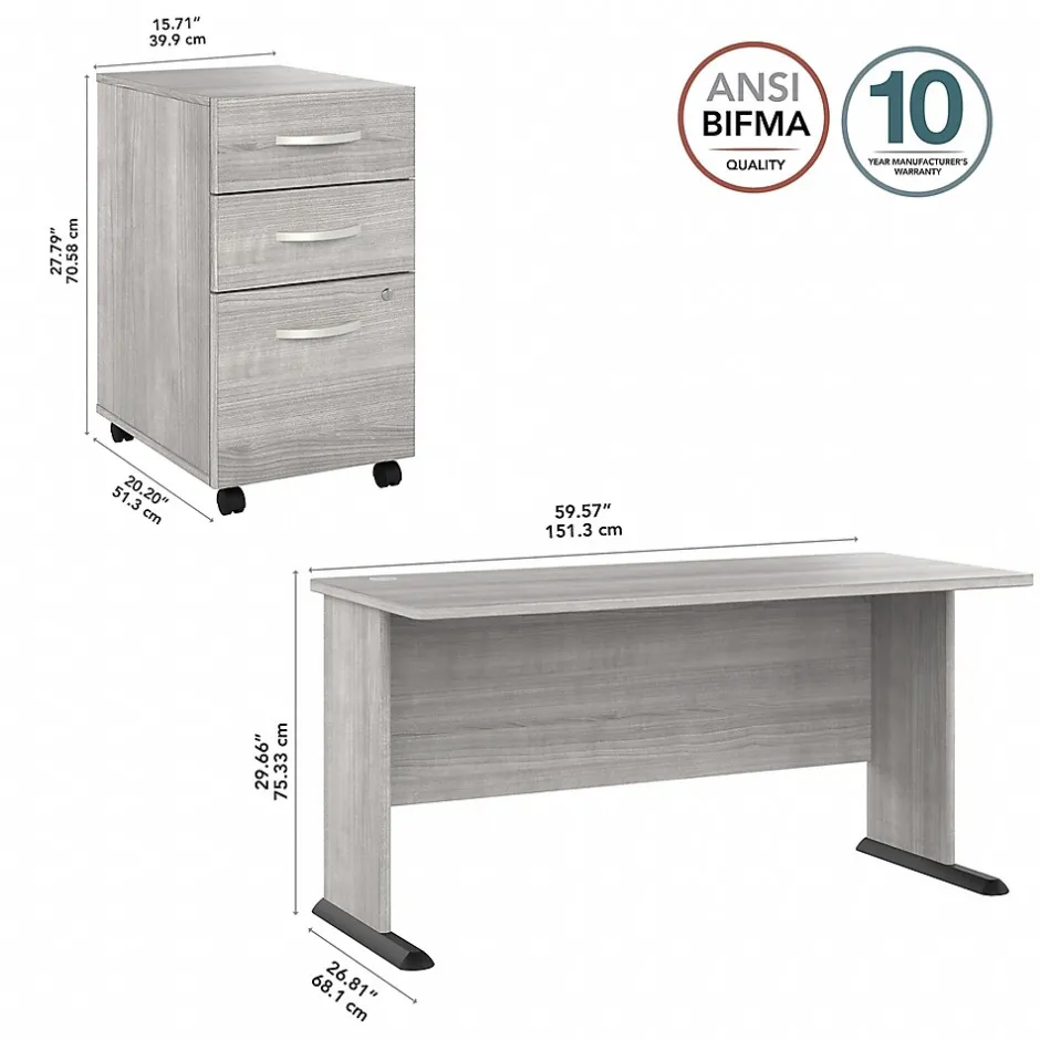 The Bush Business Furniture Studio A 60″W computer desk with three-drawer mobile file cabinet combines a fresh contemporary appearance with the commercial-quality construction needed to withstand years of everyday use. Set up with a computer and equipment on the durable thermally fused laminate desktop that supports up to 200 lbs. Two built-in wire management grommets keep cords and cables in order, so the surface remains free from unnecessary clutter. The file cabinet’s bottom drawer accepts letter-, legal-, and A4-size paperwork, while two box drawers organize supplies. The two bottom drawers can be locked to protect sensitive files and personal items. This office desk with drawers has been meticulously tested to meet or exceed the ANSI/BIFMA standards for safety, durability, and performance and is backed by a 10-year manufacturer limited warranty. American-made with US and imported parts.