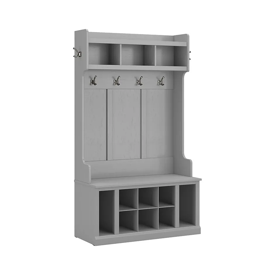 The Bush Furniture Woodland 40W Hall Tree and Shoe Storage Bench with Shelves combines transitional styling and a practical design to offer an ideal entryway organizer. Have a seat on the durable bench and take a moment to relax as you get ready to head out the door or come home after a long day. The top of the mudroom bench supports 250 pounds, so you can sit down to put on and take off shoes or set bags down with confidence. Six cubby spaces and vertical shelves on either side keep footwear of all shapes and sizes in order. The Hall Tree has four coat hooks in the front and one on each side for hanging jackets, hats, scarves and more. Smaller items like gloves and keys can be stashed inside three open compartments. This entryway bench with storage has been rigorously tested to meet Bush Furniture’s standards for safety, performance and durability and is backed by a 3 Year Warranty.