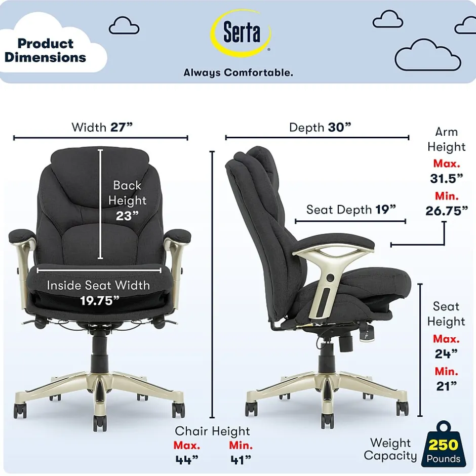 Imagine an office chair that helps promote strength and flexibility in your back. That’s the Serta Works ergonomic executive office chair with Back in Motion technology. This feature-rich, performance-focused chair helps its users become more productive and efficient by maximizing lower back support and comfort while seated. The Back in Motion active seat technology swivels the lumbar forward like the pelvis tilt exercise, promoting strength and flexibility in your core. The push-button adjustable armrests and pneumatic height adjustment can be customized to find the right fit for you. And the multilayered cushions are comfortable yet supportive, so you’ll feel refreshed and rejuvenated, even after a long day.