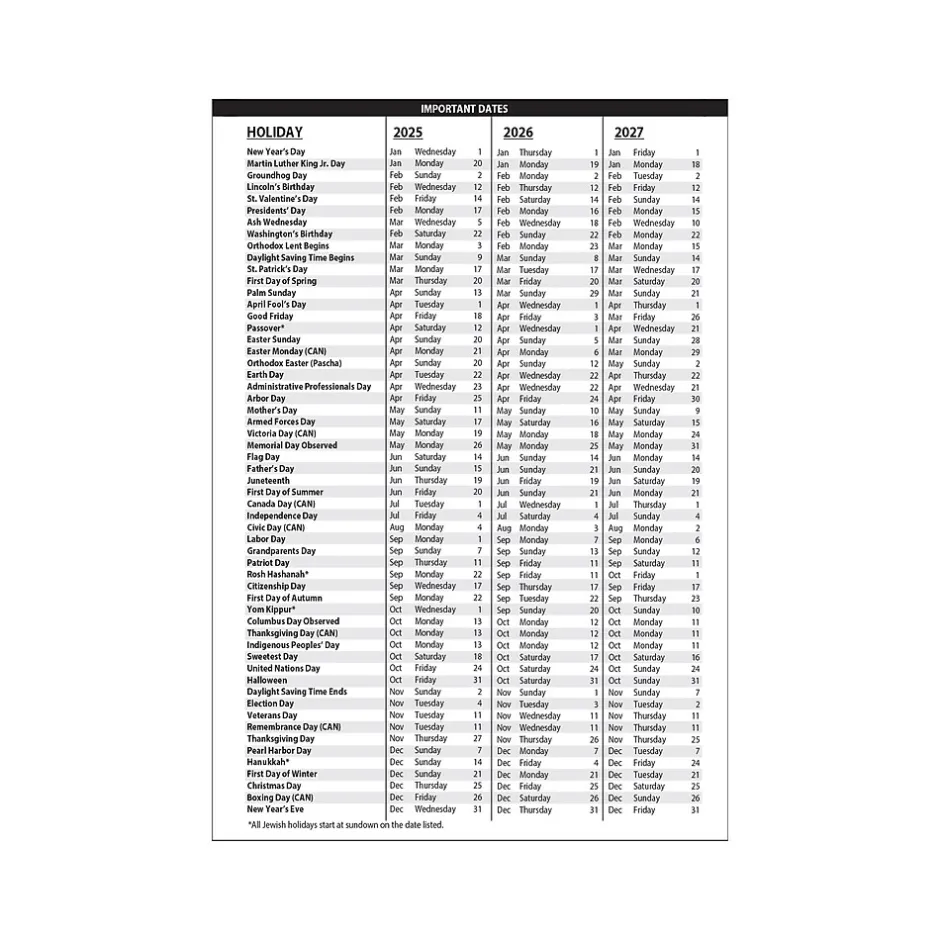 - One weekday per page, one month per two-page spread, three-year calendar reference page for long-range planning, Julian dates and days remaining for quick reference