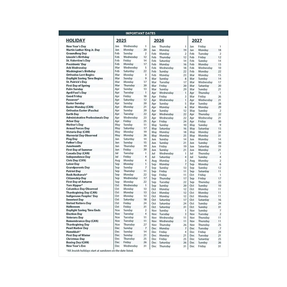 - Additional page lists important holiday dates for three years