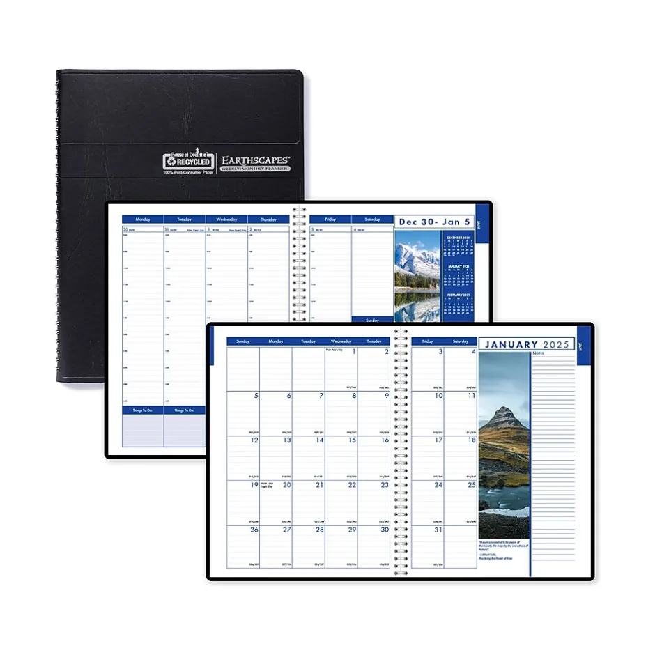 The House of Doolittle Earthscapes weekly and monthly planner offers 12 months of uninterrupted easy planning, from January 2025 through December 2025. Both monthly and weekly two-page spreads feature a full-color nature photo and a notes section to keep you organized and motivated. Plus, they include Julian dates and days remaining. Each monthly two-page spread features a tab for easy reference and also allows you to see important dates and reminders. The weekly spreads feature hourly appointments from 8:00 a.m. until 6:00 p.m. The planner is spiral-bound with 90% recycled wire and features a one-piece black embossed leatherette cover to withstand the daily use throughout the year. Printed with soy-based inks on 100% postconsumer recycled paper. Made in the USA and is FSC certified.