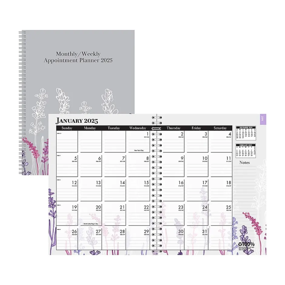 The House of Doolittle Wild Flower weekly and monthly planner offers 12 months of uninterrupted easy planning, from January 2025 through December 2025. Both monthly and weekly two-page spreads feature an area for notes to keep you organized and motivated. Plus, they include Julian dates and days remaining. Each monthly two-page spread features a tab for easy reference and also allows you to see important dates and reminders. The weekly spreads feature open slots for appointments for all seven days. The planner is spiral-bound with 90% recycled wire and features a durable two-piece cover made of 110 lb. stock that stands up to ongoing use throughout the year. Printed with soy-based inks on 100% postconsumer recycled paper. Made in the USA and is FSC certified.
