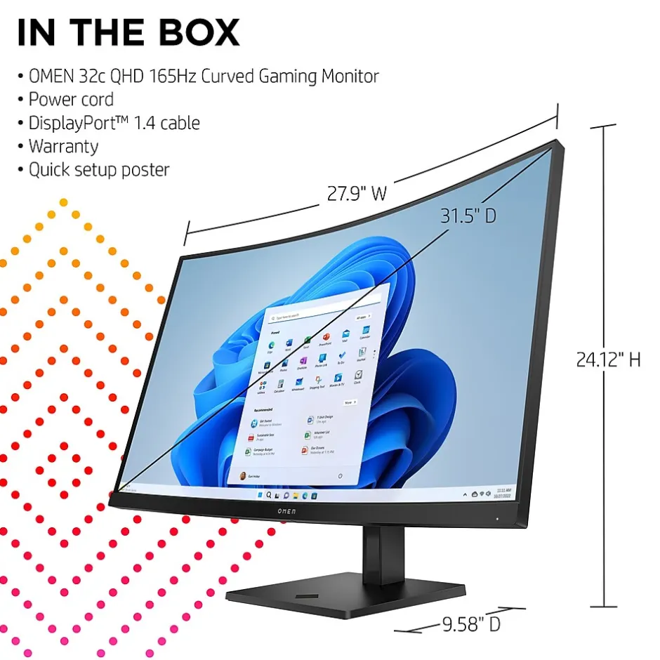 Reach next-level possibilities with the HP OMEN 32c 31.5″ QHD 165Hz curved gaming monitor. Quick performance and vibrant color let you get lost in the games you love most, while the sleek design functions to look and feel great on your desk. Play around with every possible setting in the OMEN Gaming Hub: a one-stop shop for customizing your ecosystem. Make your OMEN 32c monitor, any PC, and select accessories work better together the way you want. From hardware to software enhancements, the OMEN Gaming Hub elevates play in an easy and simple way. Remaster Mode automatically applies enhancement filters to lower resolution games so you can experience classics like never before. See image details in dark areas and brightening scenes without overexposing bright areas. Aim precisely and catch all the details with hyper-accurate edge enhancement. Equipped with ports perfect for connecting your gaming PC, console, and even a work PC. Thanks to the easy cable management and fully adjustable stand, your desk will be just how you like it.