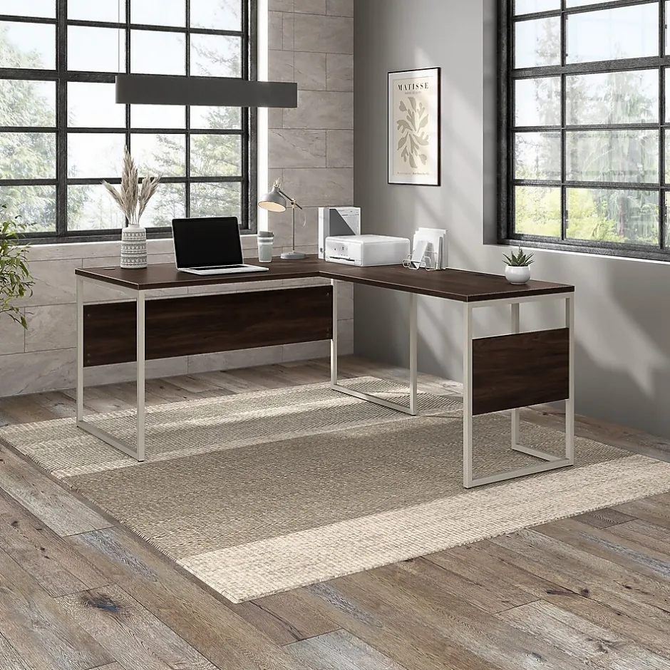 The Bush Business Furniture Hybrid L-shaped table desk blends a durable work surface with sturdy metal legs to offer a stylish, long-lasting solution for the modern professional. Tackle your next project or assignment with a computer, books, and more on a desktop that supports up to 200 lbs. Three built-in wire management grommets keep cords and cables in order, so your work area remains free from unnecessary clutter. The corner desk’s open leg design and finished privacy panel allows it to look great facing any direction in a home or professional office environment. This modern computer desk has been meticulously tested to meet or exceed the ANSI/BIFMA standards for safety, durability, and performance and is backed by a 10-year manufacturer warranty. American-made with US and imported parts.