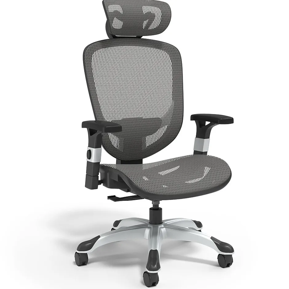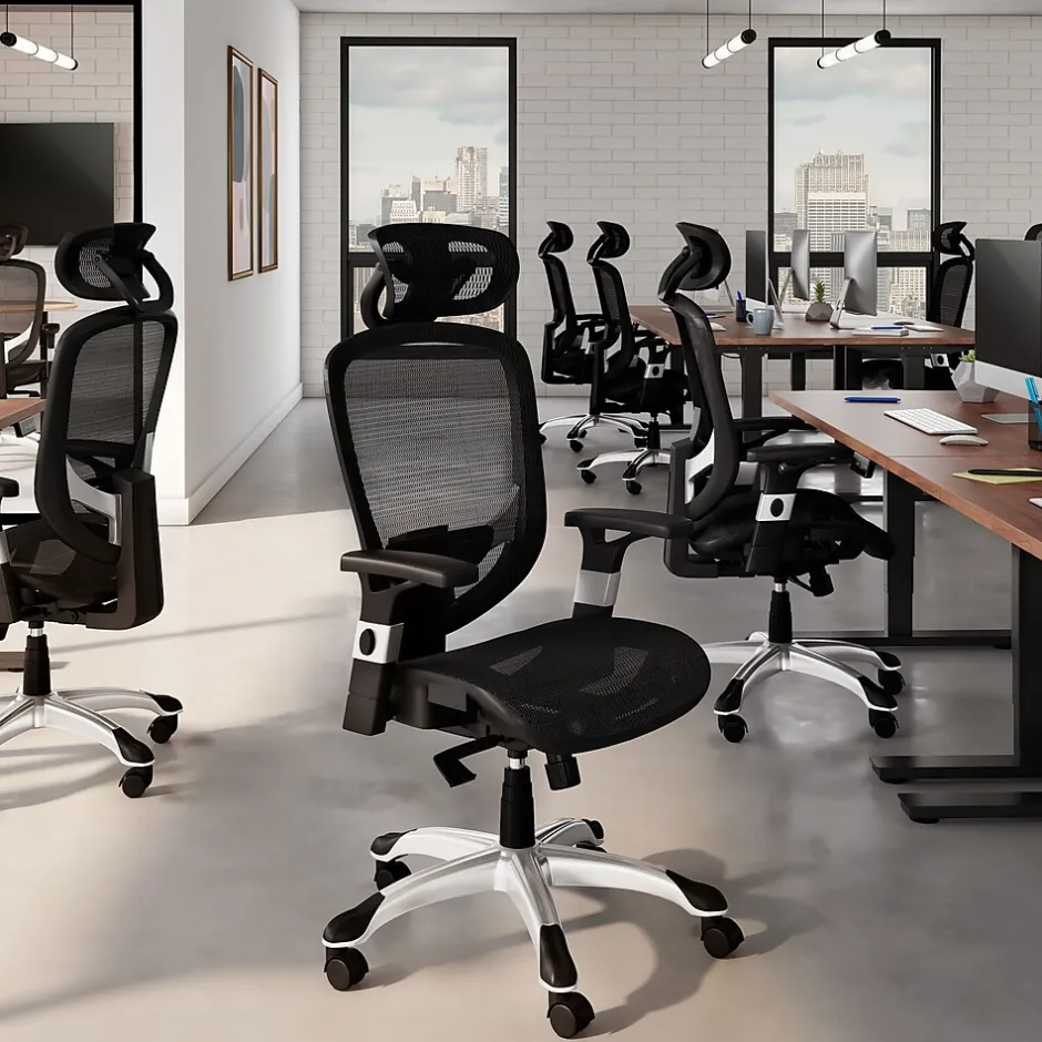 Upgrade your workspace with the Staples Hyken mesh task chair. Designed for productivity and comfort, it offers adjustable armrests and seat height for personalized support. Stay cool with its mesh back, ensuring airflow for prolonged comfort. Easily tailor recline resistance with the tension knob and secure your preferred angle with the upright tilt lock. Its ergonomic build and adjustable lumbar support provide stability and relief, while the five-star base with casters ensures smooth mobility. Meeting ANSI/BIFMA standards, it guarantees safety and performance. Additionally, the adjustable headrest enhances neck support. Say hello to a more productive and enjoyable workday, backed by the assurance of quality and value.