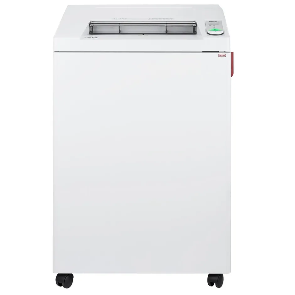 The 4002 cross-cut P-5 shredder with automatic oiler is designed for the busy office and high-volume shredding environments. Best for 8–13 users, the 4002 is rated for continuous operation. High-quality, solid steel cutting heads minimize downtime while shredding paper, staples, paper clips, credit cards, and CD/DVDs. HIPAA and FACTA compliant, and certified to shred Personal Identifiable Information (PII) and Controlled Unclassified Information (CUI), it’s federally accepted to protect information and social security numbers against identity theft. Built with a high-quality, wooden, easy-open cabinet on casters, the 4002 shredder is equipped with a large, 16” feed opening and powerhouse, impact-resistant, and easily-removable 44-gallon bin. The large but quiet 1 3/4 horsepower motor chews through 16 sheets of paper at once and up to 565 sheets per minute. A patented, electronically-controlled, transparent safety shield in the feed opening protects fingers and hands, and the patented Electronic Capacity Control (ECC) monitors and grades document feeding to prevent jams. German engineering and manufacturing ensure superior quality that will provide many years of trouble-free operation. The 4002 is covered by a lifetime warranty on cutting shafts and wheels, 3-year limited warranty on all other parts excluding wearables, and 90-day limited warranty on labor or exchange at ideal’s discretion. The 4002 is delivered by truck and requires a loading dock for receipt.