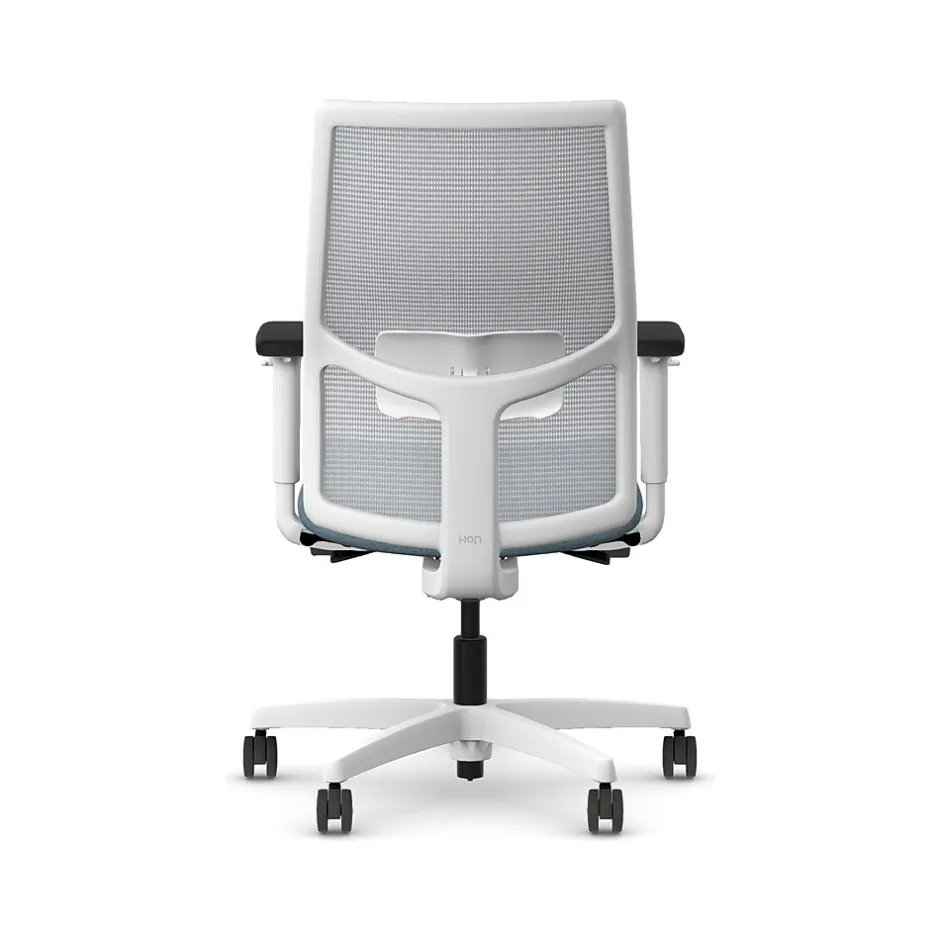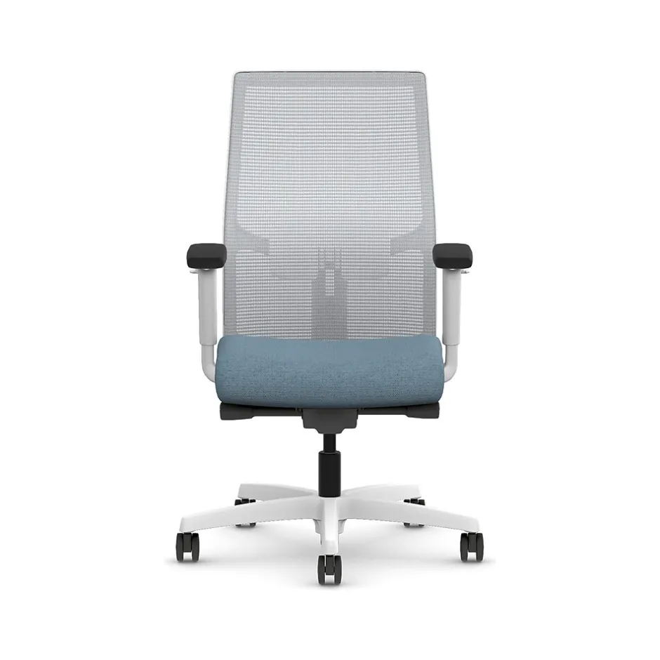 - Four-way stretch mesh back in fog gray, Hamilton Carolina blue fabric seat, and designer white frame
