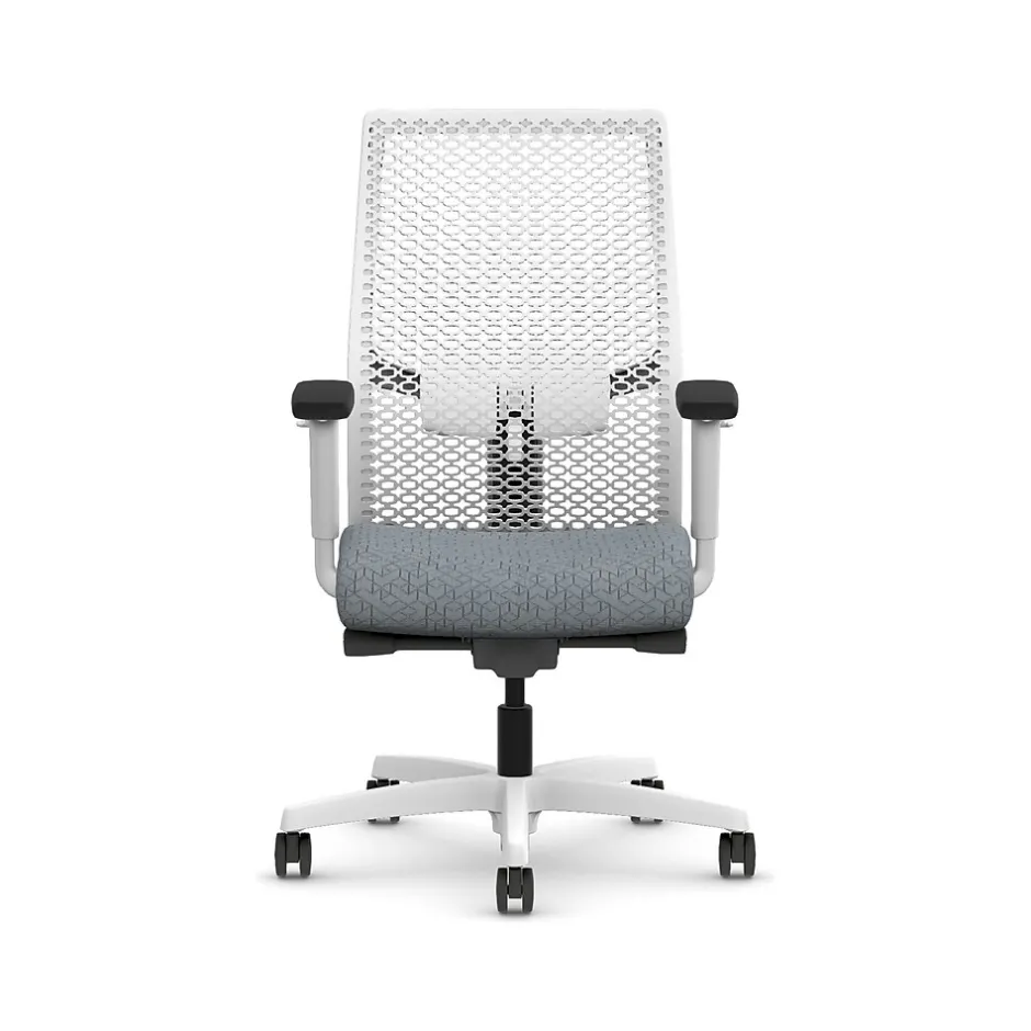 - ReActiv back in designer white, Apex basalt gray fabric seat, and designer white frame