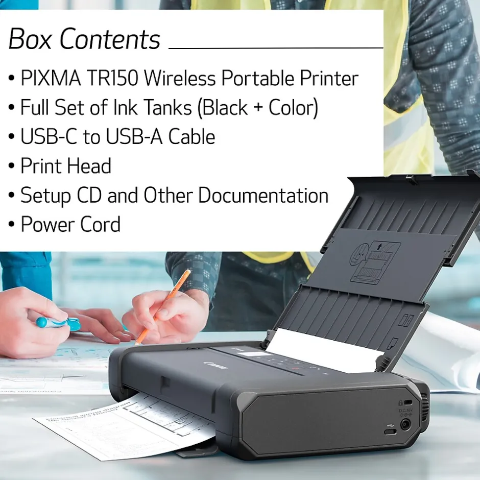 | Printer Use | Canon PIXMA TR150, set of ink tanks (PGI-35 BK & CLI-36 CL), print head, USB-C to USB-A cable, setup CD, manual, power cord |