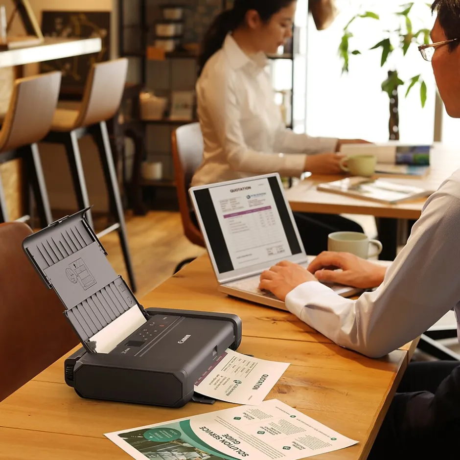 Experience the convenience and efficiency of the Canon PIXMA TR150, a wireless color borderless printer designed for home and on-the-go use. This single-function printer offers outstanding versatility with its support for various media types, including greeting cards, glossy paper, matte paper, photo paper, magnetic photo paper, business cards, envelopes, recycled paper, and labels. The wireless-ready (optional) PIXMA TR150 boasts exceptional print resolution, providing crisp and vibrant printouts in a compact and portable package. Alongside its mobile capability, the Canon PIXMA TR150 enables seamless control from your smartphone, ensuring an effortless and professional printing experience no matter where life takes you. Invest in this game-changing device to redefine convenience, portability, and quality in a wireless color borderless printer.