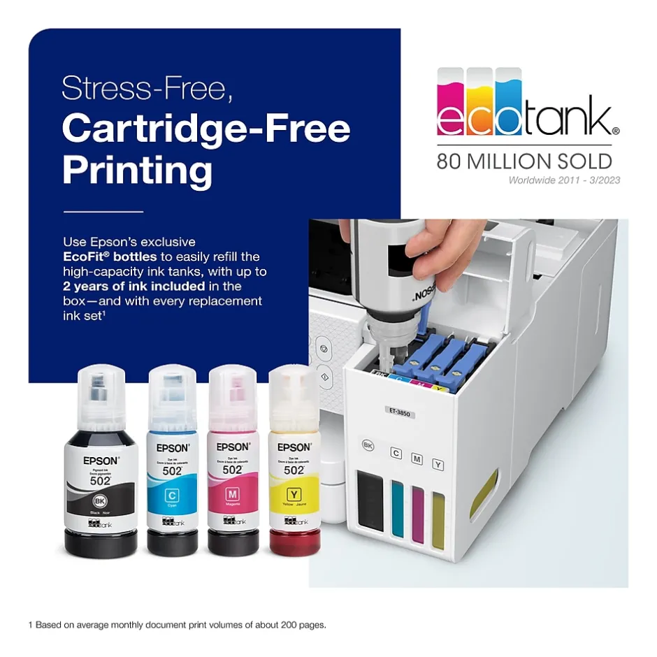 Your busy office needs a printer that’s fast, affordable, easy to use, and has great features. That’s why we developed the EcoTank ET-3850 – an innovative cartridge-free solution that uses high-capacity, easily refillable ink tanks. So you’ll worry less about running out of ink, and save a lot on replacement ink. The ET-3850 features an auto document feeder, fast printing with outstanding print quality, productive paper handling, a high-resolution flatbed scanner, and a large color display – making it the perfect printer for your home office.