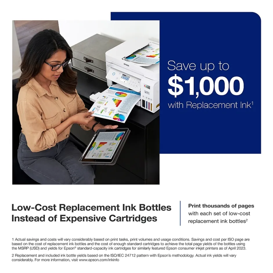 - Dramatic Savings on Replacement Ink ― Save up to 90% with replacement ink bottles vs. ink cartridges – that’s enough to print up to 7,500 pages black/6,000 color