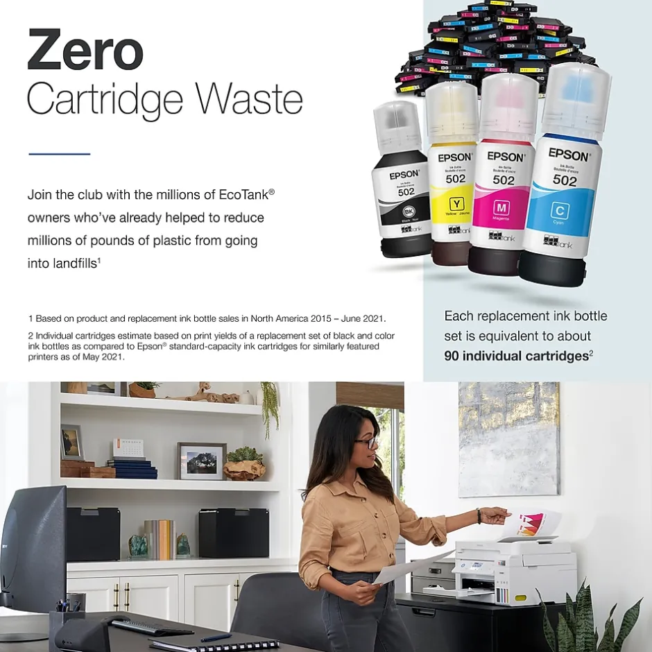 - Zero Cartridge Waste – By using an EcoTank printer, you can help reduce the amount of cartridge waste ending up in landfills