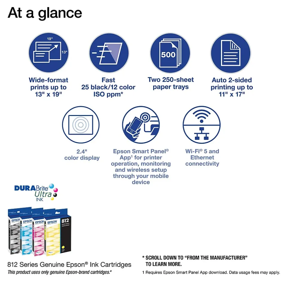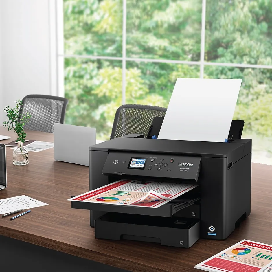 Enhance office productivity with the high-powered WorkForce Pro WF-7310. A high-performance, wide-format printing solution, the WorkForce Pro WF-7310 delivers print-shop-quality graphics up to 13″ x 19″ and borderless up to 11″ x 17″. Offering fast print speeds, this efficient printer streamlines workflow at an astounding 25 black/12 color ISO ppm. Designed with durability and reliability in mind, the WorkForce Pro WF-7310 features PrecisionCore Heat-Free Technology and DURABrite Ultra instant-dry pigment inks to quickly and consistently deliver crisp, vibrant prints with sharp text and vivid colors. The perfect choice for fast, efficient printing, the WorkForce Pro WF-7310 easily tackles high-volume print jobs with two 250-sheet trays, a rear feed and Wi-Fi 5 compatibility. Plus, with the Epson Smart Panel App, you can conveniently manage printer workflow from your smart device.