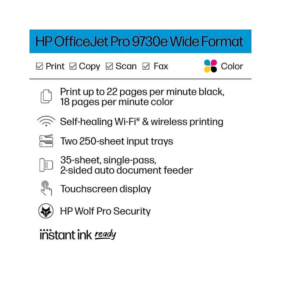 The HP OfficeJet Pro 9730e delivers fast color printing, 500-sheet paper capacity, and handles files up to 11×17″. It includes wireless and printer security capabilities to keep your multifunction printer up to date and secure, and is the world’s only wide-format printer with P3 Color.