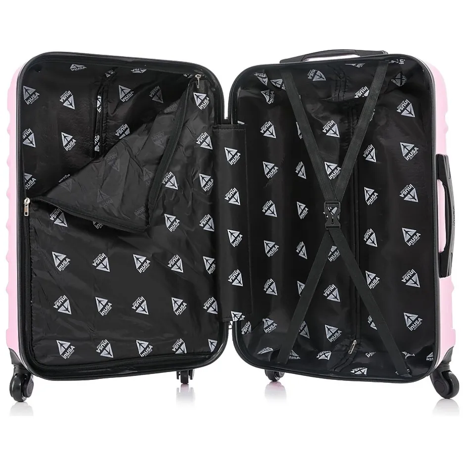 The InUSA Endurance 20″ hardside spinner luggage has a retractable trolley system, four spinner wheels, and ergonomic handles for comfortable transportation. The interior is fully lined and includes zippered compartments and elastic cross straps, while the luggage can stand upright.