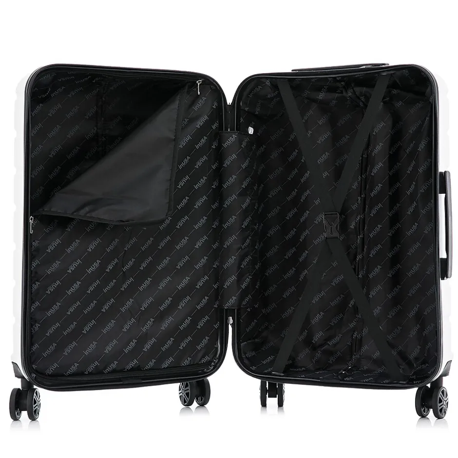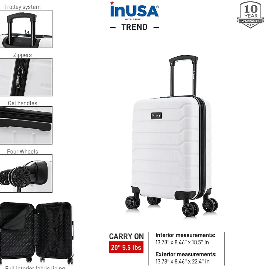 Improve your travel experience with this InUSA Trend carry-on luggage. Made of lightweight PC/ABS engineered material with a brushed finish, this luggage features push-button locking internal retractable trolley system and four dual 360-degree silent spinner wheels for smooth, effortless mobility. The hard-flex construction offers maximum strength, durability, and resistance to water and scratches. Four side studs let the luggage stand on its side, while the top ergonomic gel handles provide comfortable and easy lifting.
