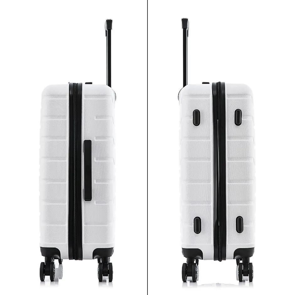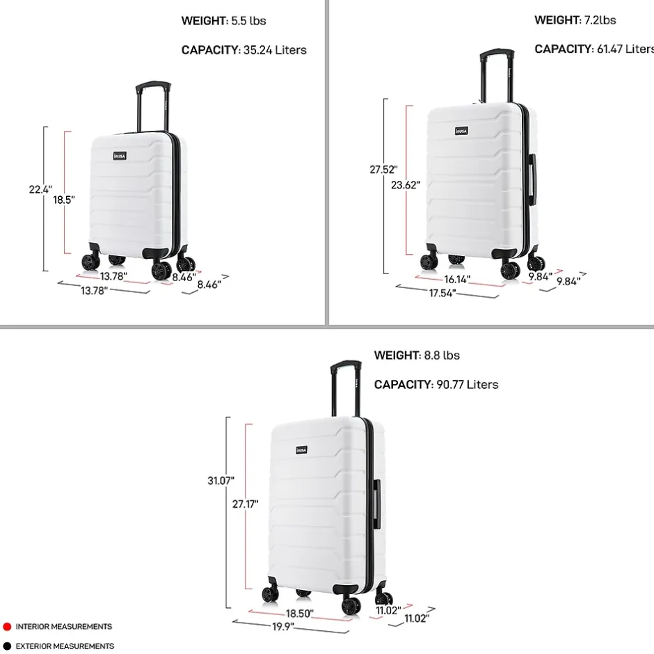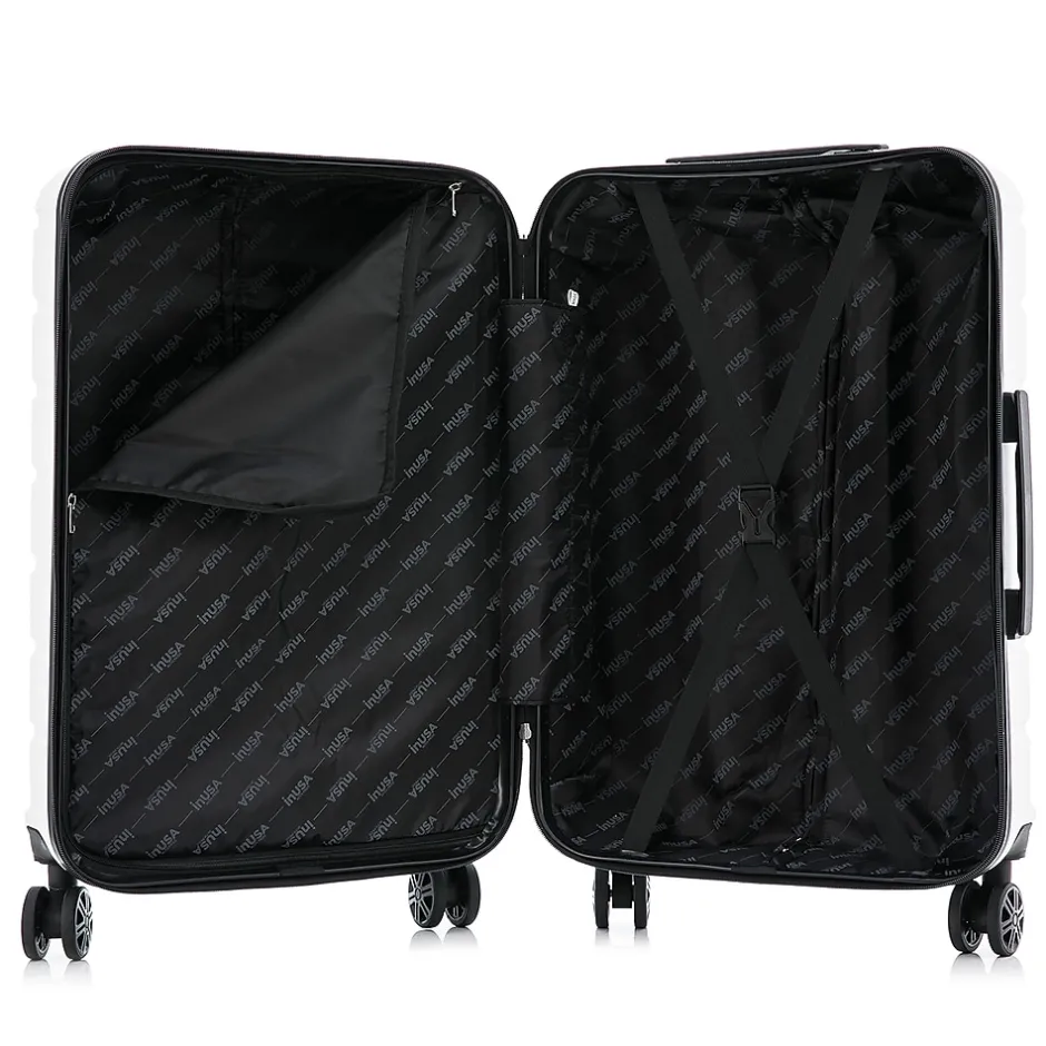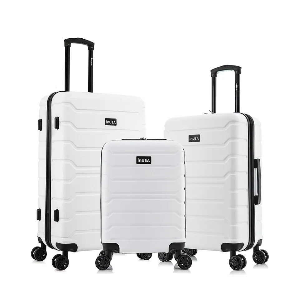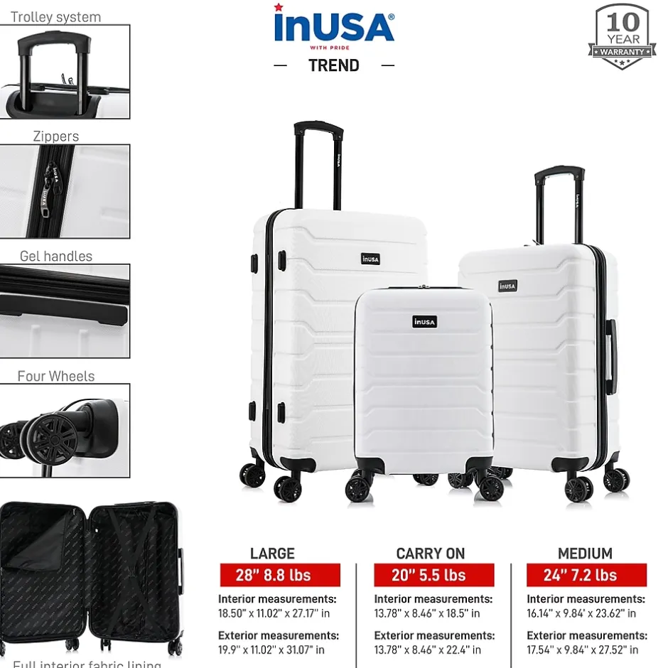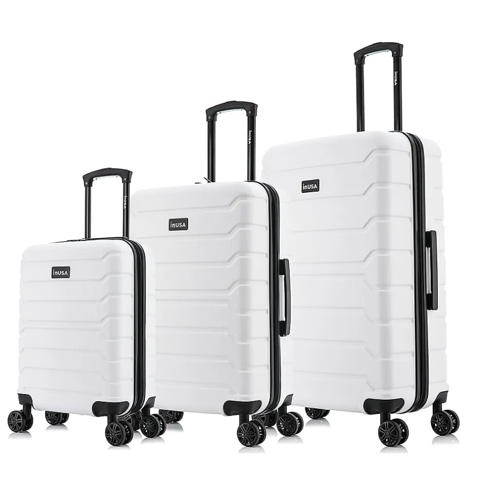 Improve your travel experience with this InUSA Trend four-wheel spinner luggage set. Made of lightweight PC/ABS engineered material with a brushed finish, this luggage set features a push-button locking internal retractable trolley system and four dual 360-degree silent spinner wheels for smooth, effortless mobility. The hard-flex construction offers maximum strength, durability, and resistance to water and scratches. Four side studs let the luggage pieces stand on their side, while the top and side ergonomic gel handles provide comfortable and easy lifting. The set includes three cases: 20″, 24″, and 28″ tall.