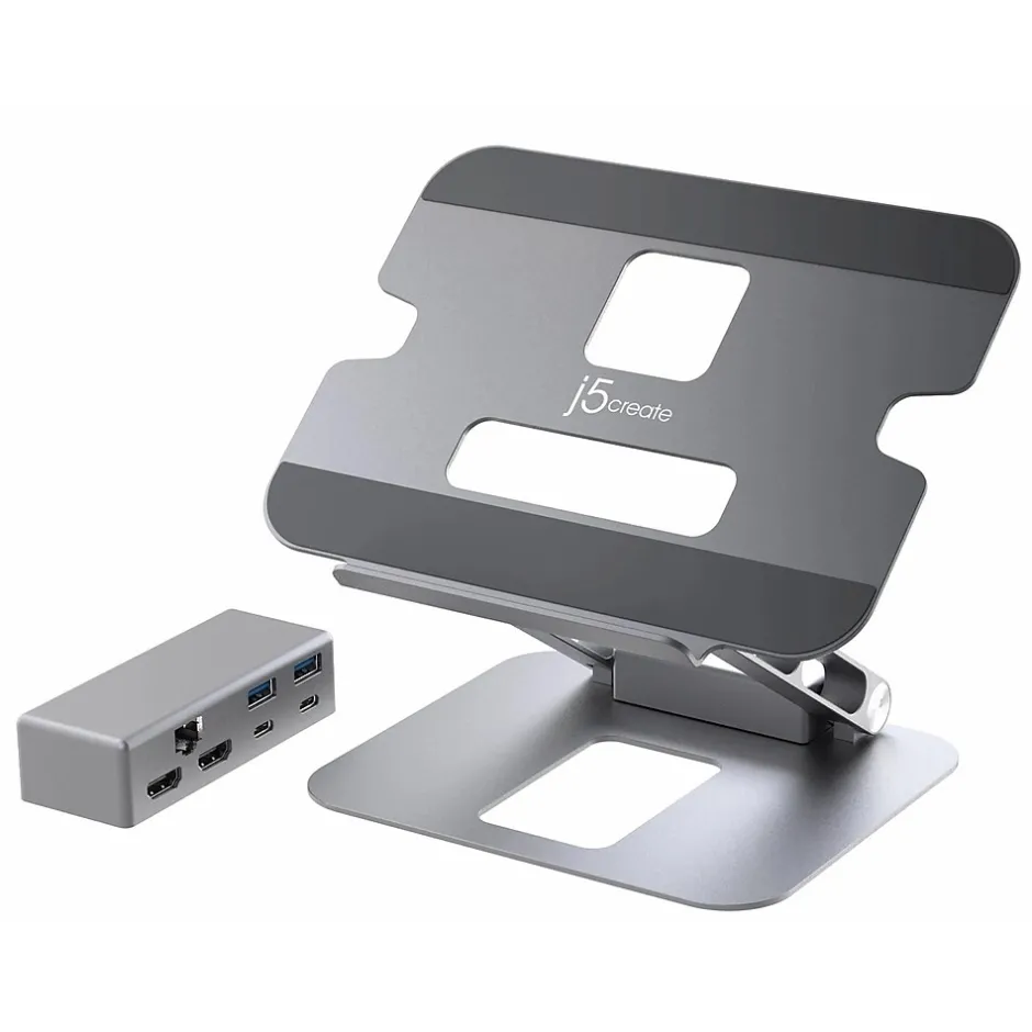 Made of durable aluminum, this j5create multi-angle stand can support a variety of items in addition to a laptop, including tablets, books, etc. The foldable design allows for easy storage or transport, while the viewing angles and heights can be adjusted to fit your needs and optimize your viewing experience. This versatile stand gives you the ability to create a more efficient workspace, whether you need extra space or a standing desk setup. The integrated USB Type-C mini dock lets you easily create a workstation with one 4K HDMI or dual 1080p HDMI display outputs, a Gigabit Ethernet port for easy network access, and two 5Gbps USB Type-A downstream ports, as well as a USB Type-C port that supports 5Gbps data transfer rate and up to 100W pass-through, providing all the connectivity you need for enhanced productivity and to connect your peripherals.