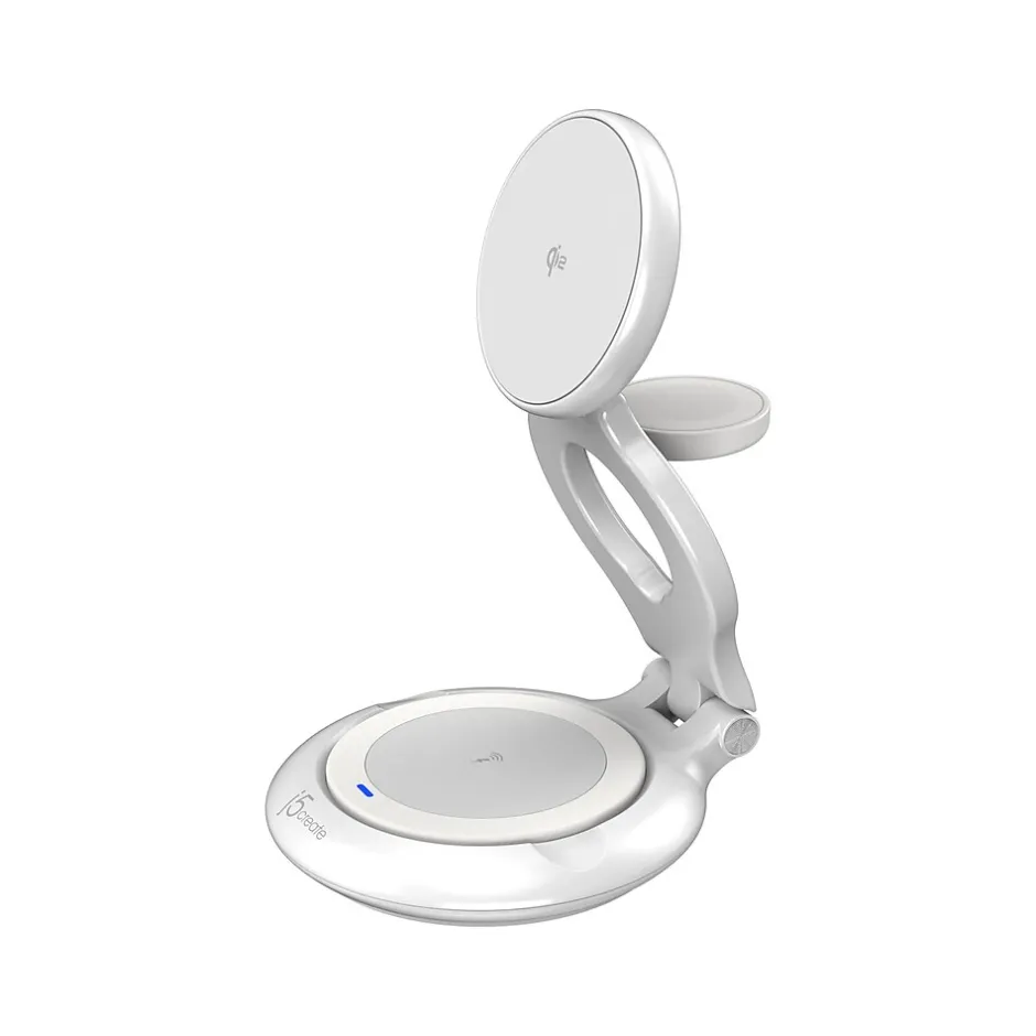 Meet the game-changer in wireless charging technology: Qi2. Utilizing this advanced wireless charging technology, the j5create Qi2 3-in-1 magnetic foldable charging station eliminates the dilemma of choosing between optimized charging for an iPhone or an Android phone. The magnetic induction technology delivers blazing-fast 15W wireless charging for both iPhones (12 and later) and Android phones. The Qi2 3-in-1 magnetic foldable wireless charging station doubles as a phone stand, with its three adjustable parts allowing multiple angles. First, the magnetic wireless charging pad can be bent up to 180 degrees front and back: flip it as you like. Second, the Apple Watch charging module can be lifted to a 90-degree angle. And last but not least, the wireless charging base can be turned 270 degrees. With a foldable design, you can fold the Qi2 3-in-1 and slip it into baggage for use on the go. A total output of maximum 22.5W is enough to charge three devices at the same time: 15W for magnetic wireless charging, 2.5W for Apple Watch, and 5W for earbuds or maybe another phone. User safety is j5create’s top priority: the product includes foreign object detection and protection against overheating, overcurrent, undervoltage.