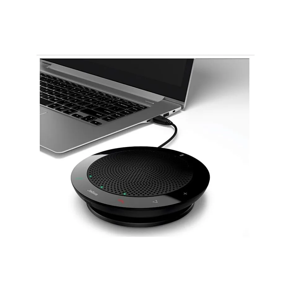 - Jabra Speak™ 410 features a built-in, omni-directional microphone and a powerful speaker that enable 360-degree coverage of up to 1 meter. This gives your employees a professional conference call solution wherever they choose to place the call.