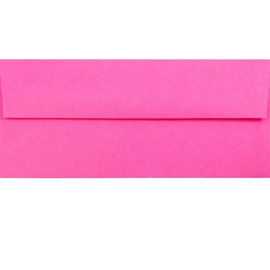 JAM Paper Brite Hue Ultra Fuchsia Hot Pink #10 Business Envelopes are made out of high quality, smooth, 24lb. paper and measure 4 1/8 x 9 1/2 inches each. This pack contains a total of 100 envelopes. Each envelope in this pack features a bright a vibrant fuchsia pink color that cannot go unnoticed in any setting! These envelopes have straight flaps and reliable gum colures to keep the contents within secure as they travel through the mail. Sized perfectly for three-time-folded standard sized sheets of paper, these envelopes can be used to send letters, documents, announcements, show tickets, and much more!