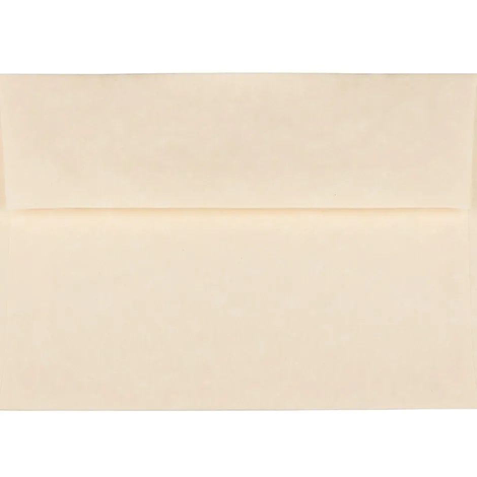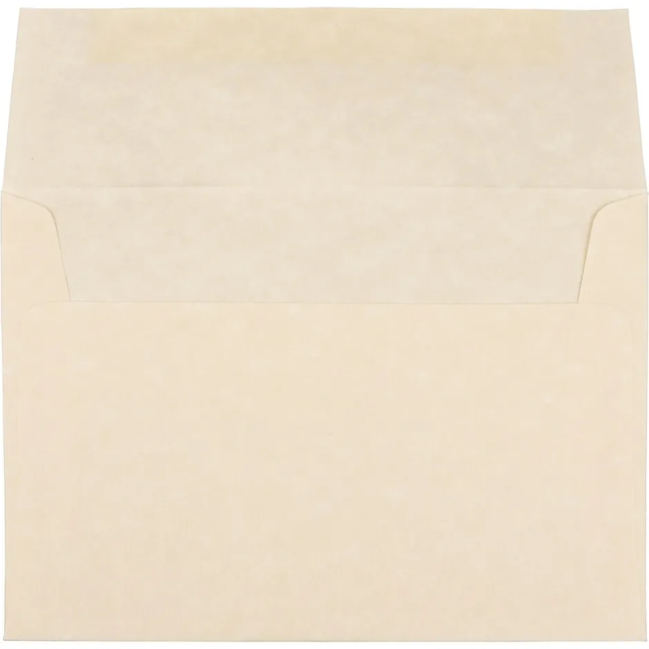 JAM PaperĀ® Parchment Natural Recycled A7 Invitation Envelopes are made out of smooth, 30% recycled, 24lb paper. Each one of these envelopes measures 5.25 x 7.25 inches in size, which makes them ideal for enclosing standard sized invitations! There is a total of 25 envelopes in this carton. Each envelope in this carton features a light brown natural parchment color with a marbled effect. These envelopes feature straight flap openings and reliable gum closures to keep the contents placed inside of them secure as they are transported through the mail! Use these envelopes to spread the word about the next upcoming occasion, to send greeting cards, and more!