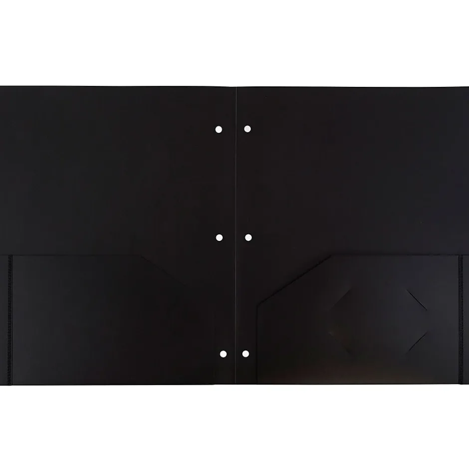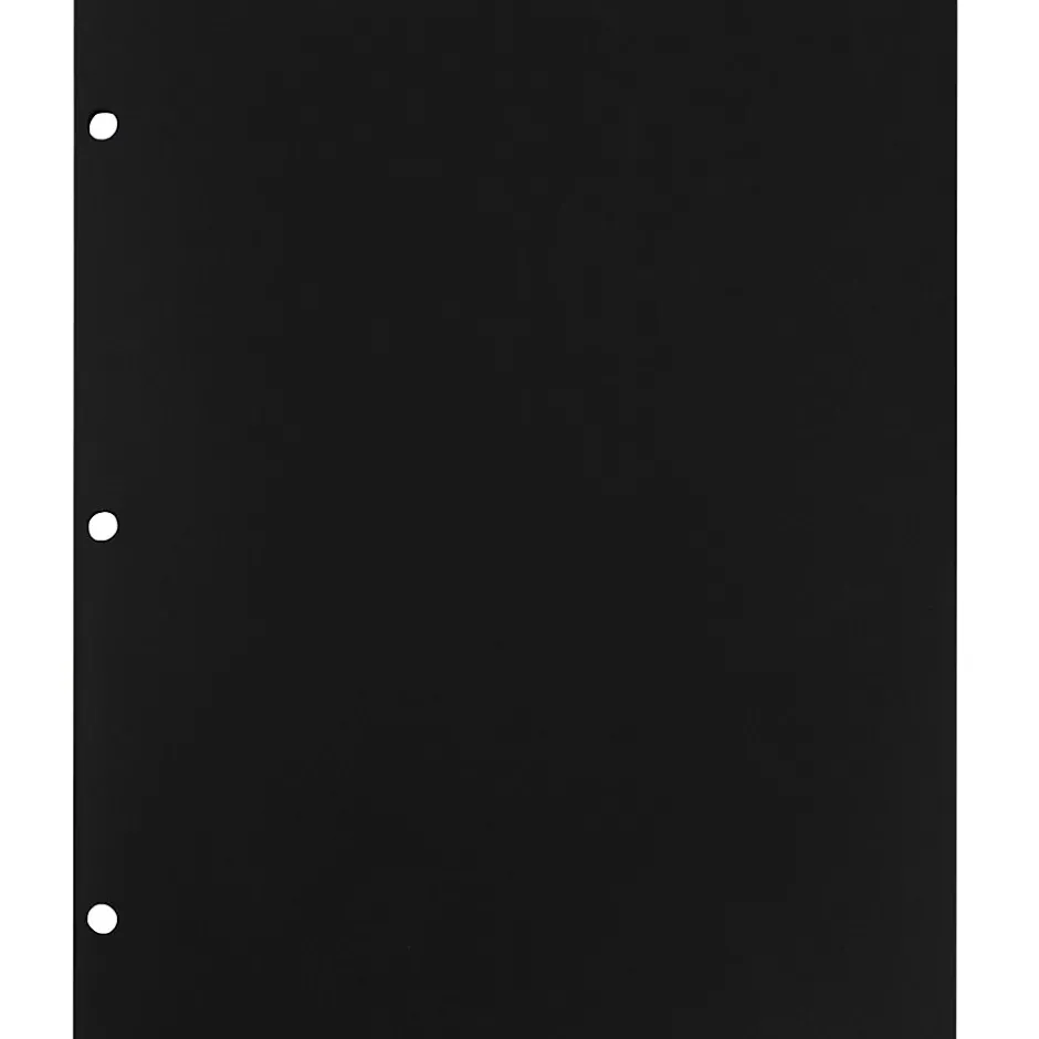 JAM PaperĀ® Black Plastic Two Pocket 3 Hole Punched Presentation School Folders are 9in x 12 inches in size and are made out of heavy duty, pliable plastic. In this large pack, a total of 108 folders is included. Each of these folders features two pockets on the inside. The right side pocket features two slots for business card slots and other small documents. Each folder has three holes in a vertical row on the left the side for placing and securing them into binders. These folders have a jet black color that gives them a versatile edge. Use them in any school or office setting to organize documents and to keep them safe from damage.