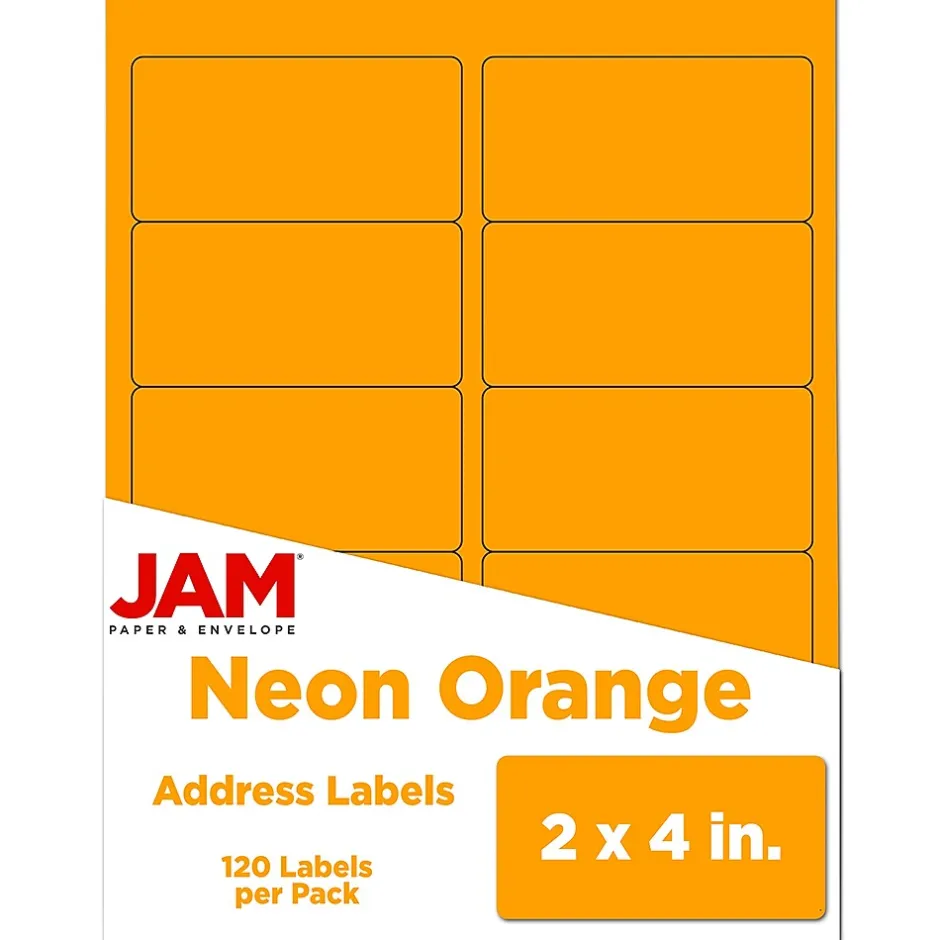JAM Paper Neon Fluorescent Orange Medium Shipping Labels will make anything they are placed on stand out anywhere with their vibrant, blazing neon orange color! These labels feature a rectangular shape with rounded corners measure 2 x 4 inches and are sold on sheets of 1 labels. In each pack, there are 12 sheets for a total of 12 labels! These bright labels are printer friendly, making them ideal for creating custom address labels in your own home or office. They can also be easily written on with pens or markers. Black and their dark colors create a contrast and show up brilliantly on their bright surface. Use them for mailing, organizing, and more!